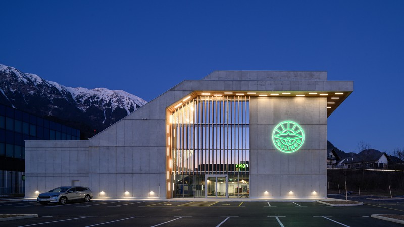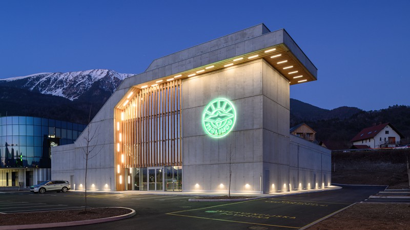 Arhitekturni biro STVAR | Za švedsko podjetje Inclined Labs smo načrtovali edinstveno stavbo s horizontalnim in pomičnim poševnim vetrovnikom. Patentirano tehnologijo poševnega vetrovnika je investitor razvil v nekdanjem laboratoriju letalske tovarne SAAB v Stockholmu, kjer od leta 2016 obratuje prototip. V Sloveniji je postavljena prva tovrstno načrtovana stavba, kjer opremo in motoriko v poševnem vetrovniku lahko preizkušajo smučarski skakalci in t.i. wingsuit letalci, v horizontalnem vetrovniku pa kolesarji in alpski smučarji. Poleg lokacijskih dejavnikov je bilo poglavitno izhodišče arhitekturne zasnove v pravilni umestitvi celotnega postroja vetrovnika in ustreznem funkcioniranju stavbe v skladu s pričakovanji investitorja. Tehnologija vetrovnika je zasnovana kot zaprta 3D krožna zanka, v kateri so umeščeni pogon (ventilator), vogalni usmerniki zraka z integriranim hlajenjem, v naklonu 14°-34° premična komora poševnega vetrovnika in horizontalni vetrovnik. Ločeno so vključeni tudi prostori za elektro postroj s transformatorsko postajo in hladilni sistem. Potreben volumen tehnologije določa maksimalne zunanje tlorisne in višinske gabarite stavbe. Vetrovniška zanka in pripadajoči postroja predstavlja samostojno klimatsko cono. V središču vetrovniške zanke je umeščen toplotno in zvočno izoliran volumen spremljevalnih prostorov, z etažnostjo P+1+2, pri čemer je del 2. nadstropja zamaknjen v smislu medetaže. Z zasnovo medetaže povežemo 1. in 2. nadstropje v dinamičen, vizualno in svetlobno atraktiven enoten volumen, obenem pa zagotavljamo neposreden prehod na ravno streho ter vhode v poševni vetrovnik na različnih nivojih, v skladu z zahtevami investitorja. Stavba v zunanji podobi kljub asketskemu izboru materialov jasno izpričuje svoj notranji ustroj. Fasada postroja je zasnovana geometrijsko členjenem vidnem betonu s panoramsko zasteklitvijo glavnega vhoda, ki nudi vpogled v tehnološko drobovje in razkriva samo bistvo stavbe, t.j. poševni vetrovnik. Del toplotno izoliranega osrednjega dela stavbe, ki sega iznad oboda vetrovniške zanke, je zasnovan v toplejši, leseni fasadni podobi. Ravne strehe so zasnovane na različnih nivojih skladno s potrebami tehnologije in spremljevalnih prostorov. Del strehe nad poševnim vetrovnikom, oz. glavnim vhodom, pa je zasnovan v naklonu z gornjim zaključkom v tehnološkem stolpu, ki se s konzolnim nadstreškom interpretira kot krilo letalskega repa, kar že na daleč nakazuje vsebino stavbe. Vstop v stavbo vodi skozi spektakularen prostorski volumen pod komoro poševnega vetrovnika, ki obenem služi kot vetrolov pred vstopom v recepcijo ali v predprostor horizontalnega vetrovnika. Preostali del pritličja je namenjen sanitarijam z garderobami za obiskovalce ter komunikacijskemu jedru, ki je umeščeno kot zvočni filter proti strojnici vetrovnika. Osrednji del prostora 1. nadstropja je namenjen t.i. ''wingsuit'' letalni sekciji, kjer se nahaja tudi spodnji vhod poševnega vetrovnika. Preostali del 1. nadstropja služi izključno osebju. V sklopu komunikacijskega jedra proti 2. nadstropju se nahaja medetaža, ki služi kot sprostitveni prostor, oz. t.i. ''lounge'' za obiskovalce. Na severni strani se odpira pogled proti gorski verigi Karavank z izhodom na teraso na ravni strehi, v notranjosti stavbe pa odprt pogled proti poševnemu vetrovniku, navzdol proti 1. nad. in navzgor proti 2. nad.. Iz medetaže se dostopa tudi v prostor kontrole poševnega vetrovnika, ki se nahaja nad popolnoma stekljeno letalno komoro. Osrednji del prostora 2. nadstropja je namenjen t.i. smučarsko-skakalni sekciji, kjer se nahaja zgornji vhod poševnega vetrovnika. Na južni strani se odpira panoramski pogled proti planoti Jelovica, na severni strani pa odprt pogled navzdol proti medetaži. Vzdolž zaledja pritličja so umeščeni ločeni tehnični prostori za urejeno umestitev obsežnega postroja za obratovanje tehnologije in stavbe, z dostopom od zunaj. Vsebina vetrovniške zanke in servisni dostopi do le-te so v celoti zasnovani tako, da je pooblaščenemu osebju možno dostopati v vsak posamičen segmet s terena po obodu stavbe, kjer je v ta namen osnovana tudi ustrezna zunanja ureditev, ki obenem omogoča večnamensko uporabo za treninge na prostem.